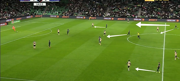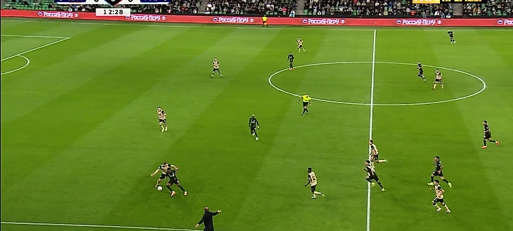 Был и эпизодический прессинг, где каждый игрок соперника накрывался 1в1. Особых бонусов не принес, пару раз даже подвел, но как-будто без него вышло бы совсем грустно.