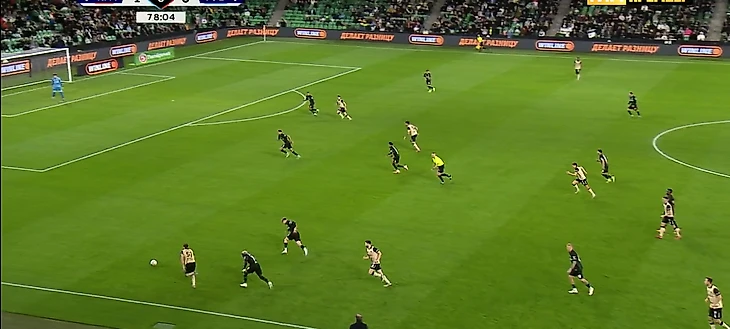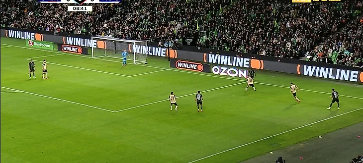 Другому опасному моменту казанцев, а точнее штрафному, с которого он пришел, предшествовала потеря концентрации Торменой. При желании можно попробовать додумать, что Витор, не найдя себе оппонента, пошел к ближайшему (с которым играл Ленини), и ради исполнения установки оставил огромную свободную зону. Другого объяснения такому выбору позиции при позиционной обороне я дать не могу, но и это звучит крайне бредово.