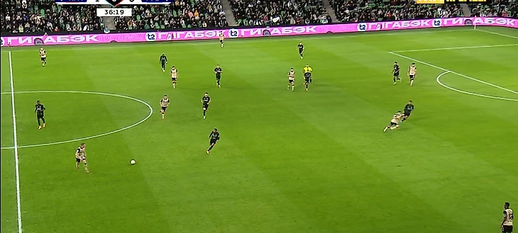 Началась голевая атака «Краснодара» в билд-апе 2+4, где продвижение пошло через флангового игрока. Максимально наглядный пример, чем 2+4 в начальной стадии (на чужой половине у него несколько другие свойства) лучше более узкого 3+1. С выходом из-под прессинга нет проблем ни в одном из вариантов, но я все же выступаю за возвращение к более сбалансированным 2+3 или 3+2.