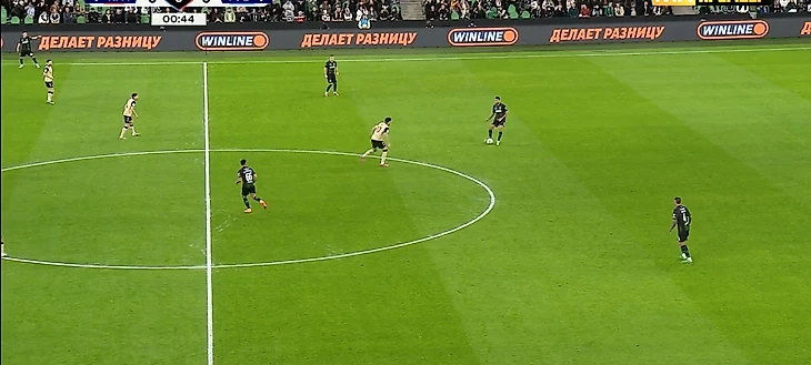 Центр перекрыт – единственным вариантом продолжения была передача по флангу Сперцяну, но тот мастерски пропустил мяч, отрезав еще одного соперника от эпизода. Мало кто в РПЛ может так почувствовать эпизод, но на то он и один из двух лучших игроков лиги.