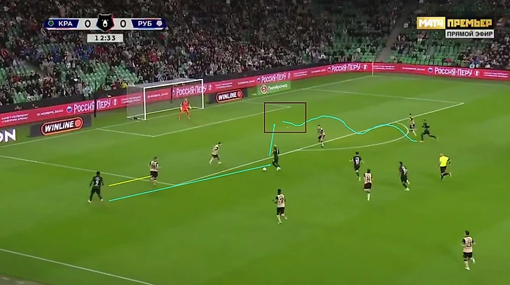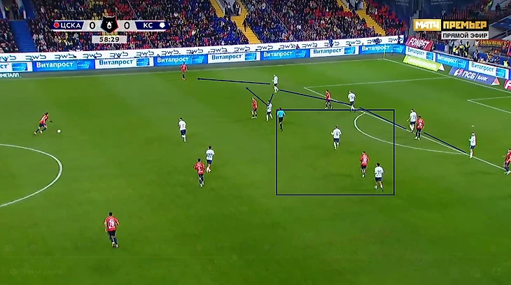 Все розыгрыши низом строятся исключительно на Джаваде, более вертикальное продвижение ненадежно — чаще надо прибегать к актуальному, но в таком количестве с действиями одного игрока — аномалия. Вот очередной пример из матча с «Ростовом»: