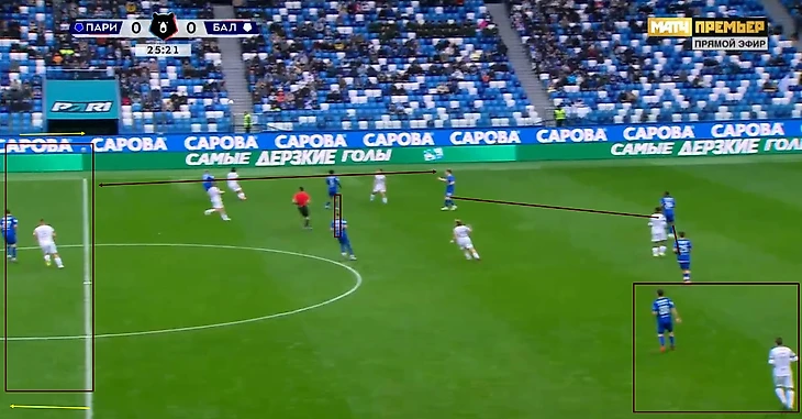 Команда Шпилевского очень грамотно против «Балтики» выступила на этих выходных. Прежде всего благодаря гибкой структуре обороны, где: Лесовой садится ближе к защитникам, а при разворотах выступает в гибридной роли, сохраняется большинство в центре, и присутствует гибридность исполнения при поднятиях, но при этом меньше давления первой линии против нестабильно качественно продвигающих мяч защитников «Балтики».