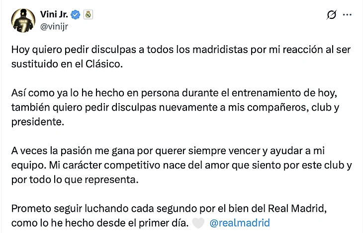 Винисиус извинился за истерику в класико. Перед игроками, клубом, Пересом... А Хаби?