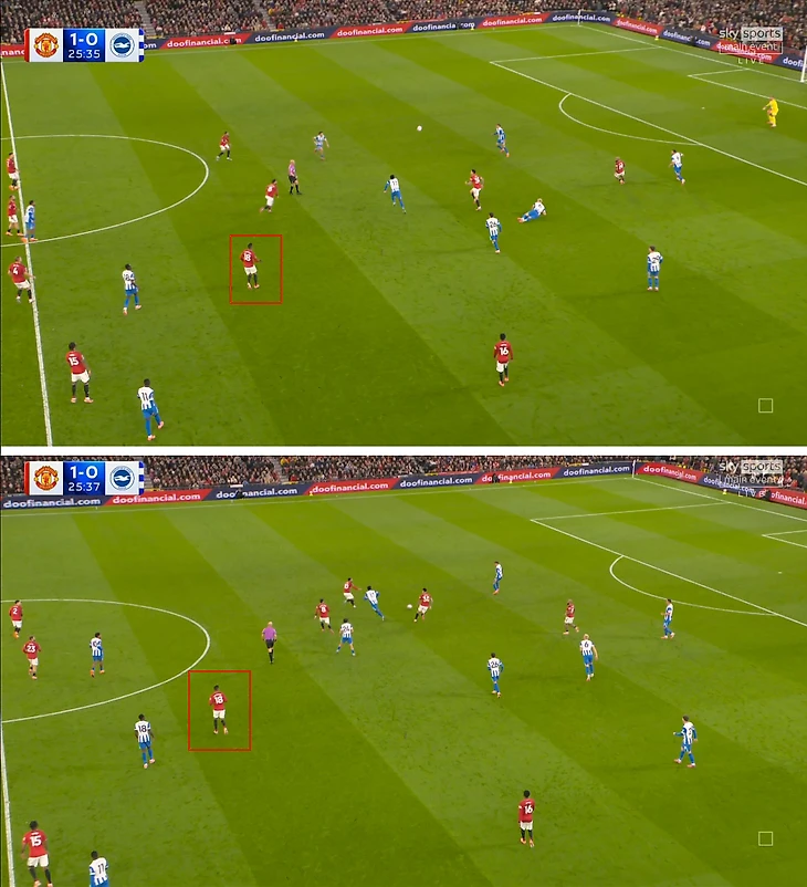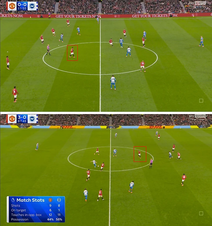 С первых минут против «Брайтона» бразилец диктовал темп и заправлял полузащитой «Юнайтед» – участвовал почти в каждом эпизоде, в обороне и атаке. Его сольное доминирование вылилось в два ключевых эпизода в первом тайме.