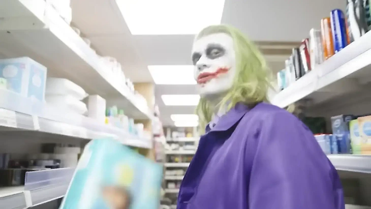 В образе злодея Холанд вышел… за подгузниками. На заправке покупатели сперва растерялись, но быстро понимали, кто стоит перед ними. Реакции — от смеха до легкого ужаса.