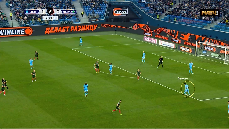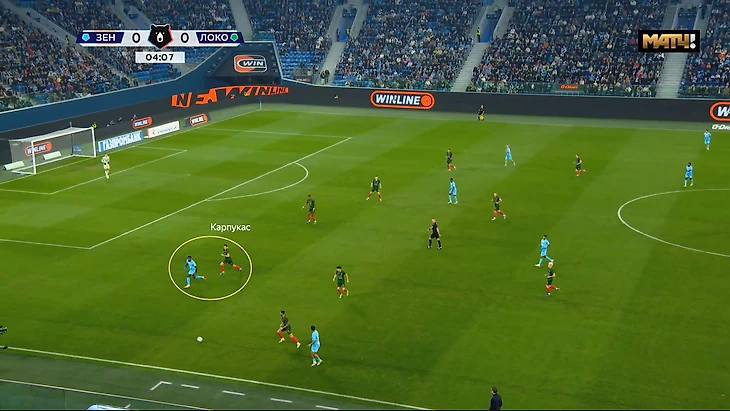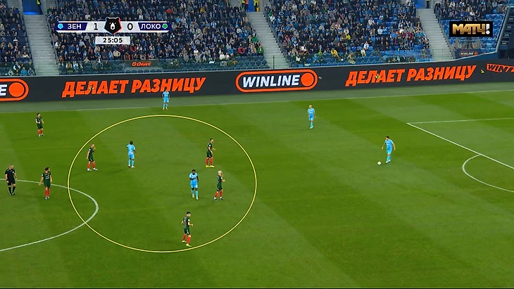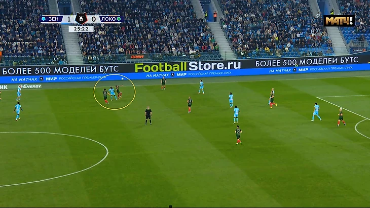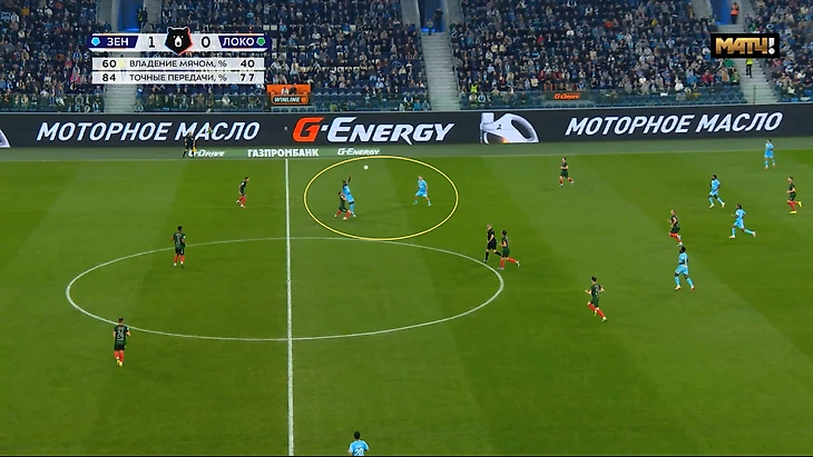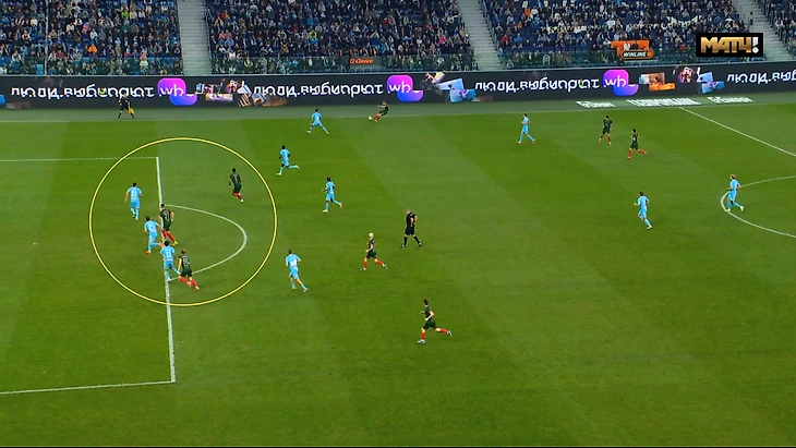 Если мяч переходил на фланг, то гости пытались создать максимальную плотность в зоне мяча: зачастую футболистов «Зенита» разбирали персонально. Здесь даже центральный защитник Ньямси до конца пошел за своим оппонентом.
