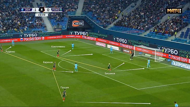 Смена фланга сработала и в эпизоде с первым забитым мячом. Схема «Локомотива» с четверкой не позволяла закрывать всю ширину.