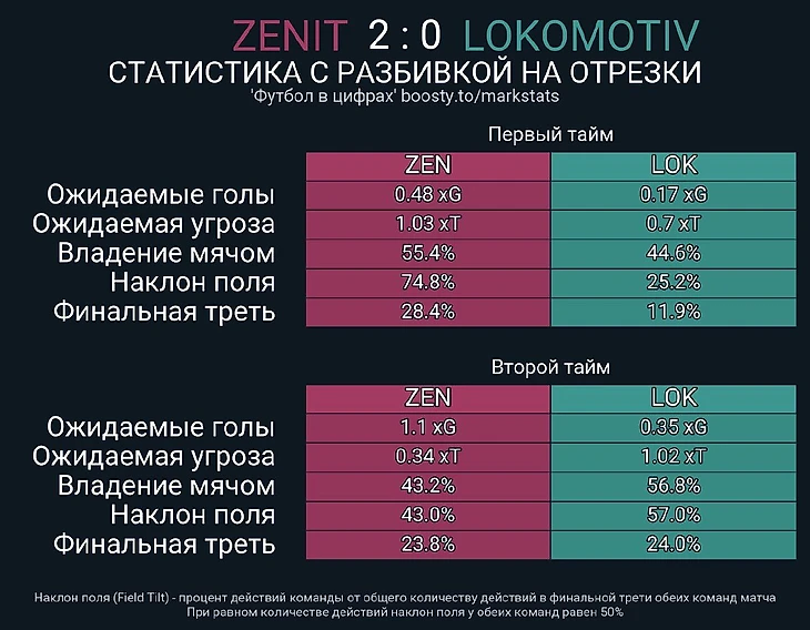 Команда Галактионова не смогла создать практически ничего у чужих ворот: 0.52 ожидаемых гола против 1.58 у «Зенита» и 0 – 3 по явным голевым моментам.