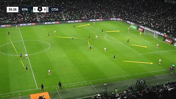 1. Весь первый тайм «Краснодар» при прессинге расставлялся 6-в-6 на трети «Спартака». На 17-й минуте Максименко от безысходности выбил в сторону Манфреда Угальде, после чего решил разыграть коротко. Еще и через Денисова – естественно «Краснодар» принудил к длинной на Агкацева. И помчался забивать.