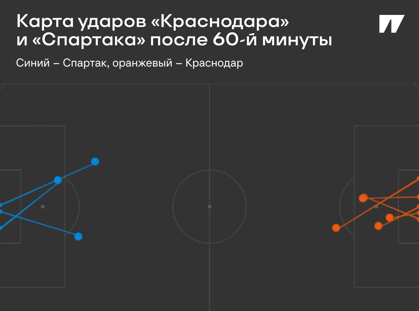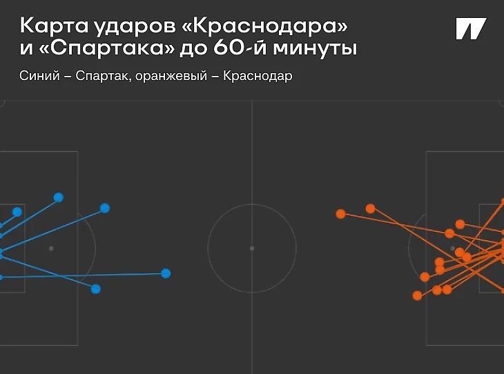 Это карта ударов «Краснодара» и «Спартака» до гола Джона Кордобы: доминирование команды Мурада Мусаева против двух ударов гостей из штрафной. Важно, что первый удар из нее пришел на 36-й минуте – и это тычок Пабло Солари на трибуны.