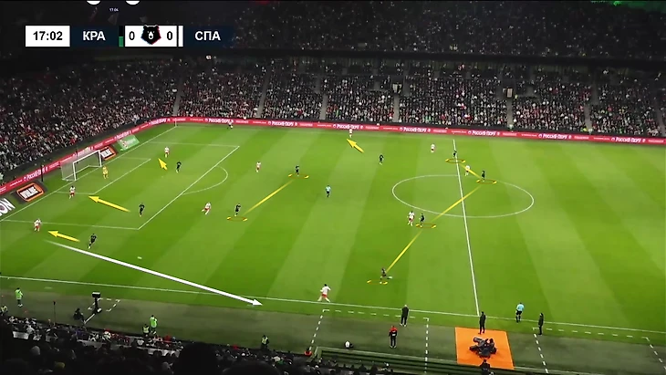 Показательный момент: как «Краснодар» и «Спартак» оборонялись, когда их заставляли пятиться к воротам. Команда Мусаева цивилизованно отбивалась, а Станковича – пласталась по вратарской без акцента на зону или игрока.