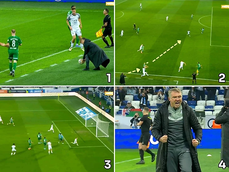 Наставник калининградцев подхватил мяч и быстро бросил его футболисту своей команды для розыгрыша аута. Саусь тут же вбросил мяч из-за боковой, Хиль в касание сыграл пяткой, а Максим Петров забил в дальний угол: от «паса» Талалаева до гола прошло всего 6 секунд.