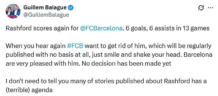 Известный испанский футбольный эксперт Гильем Балаге в соцсети Х написал, что в «Барселоне» очень довольны Маркусом Рэшфордом.