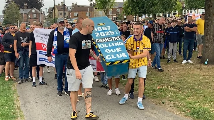 1) Фанаты радуются банкротству своего клуба. Чему тут радоваться, скажете вы? В Шеффилде, точнее в синей его части, с вами не согласятся. «Шеффилд Уэнcдэй» давно испытывал огромные финансовые сложности, и еще в начале августа были сомнения в том, что команда вообще начнет сезон – игрокам не платили зарплату, а менеджер Дэнни Ролл ушел за неделю до начала чемпионата. Со всем этим ворохом проблем «Совы» быстро скатились на дно таблицы, а фанаты провели ряд акций протеста против владельца клуба тайского бизнесмена Чансири, включая вынос гроба клуба и объявление бойкота на посещение матчей.