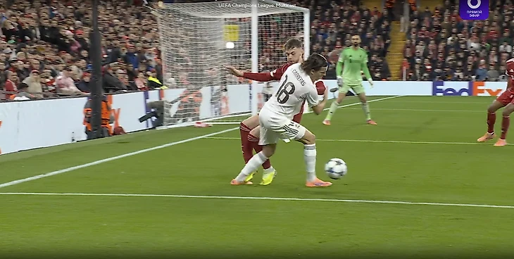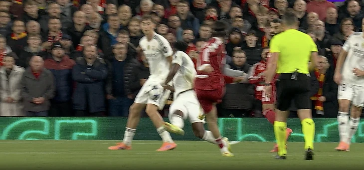 На 30-й минуте Ковач назначил опасный штрафной за руку Тчуамени. Но контакт был внутри штрафной. Почему Ковача позвали к монитору? Сразу было понятно: чтобы не назначать пенальти.