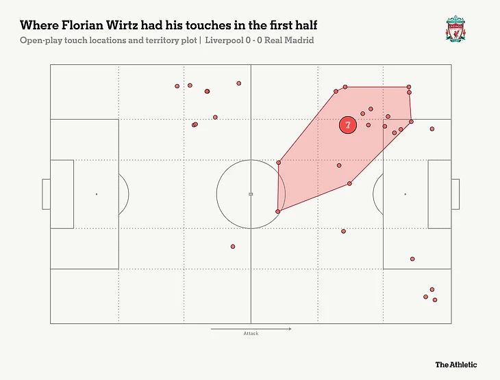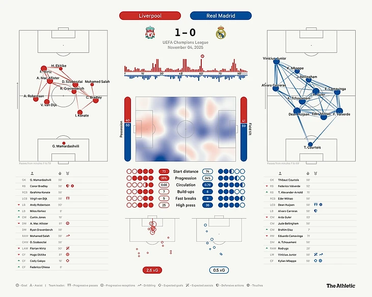 В промежутках было несколько забегов между линиями, чтобы запутать мадридцев, быстрые передачи с отскоками, чтобы вывести «Ливерпуль» в комбинации, и многообещающие взаимодействия с Экитике. Ближе к концу первого тайма также был отличный момент уйти от давления, заработать фол в центре поля и обменяться передачами с Маком Аллистером, в результате чего был нанесен еще один удар.