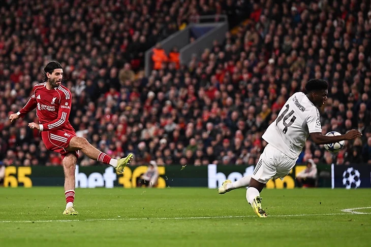 Главной темой для разговоров в первом тайме стал момент, когда полузащитник «Ливерпуля» Доминик Собослаи нанес удар по воротам примерно с 25 метров, а полузащитник мадридцев Орельен Тчуамени бросился под мяч.