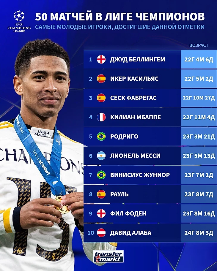 До этого рекорд принадлежал Икеру Касильясу, вспомнил Transfermarkt. Легенда «Мадрида» отыграл свой 50-й матч в ЛЧ, когда ему было 22 года, пять месяцев и два дня. Третью строчку занимает еще один испанец – Сеск Фабрегас, которому планка покорилась в 22 года, 10 месяцев и 27 дней.