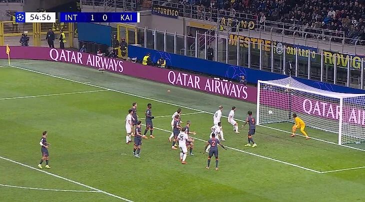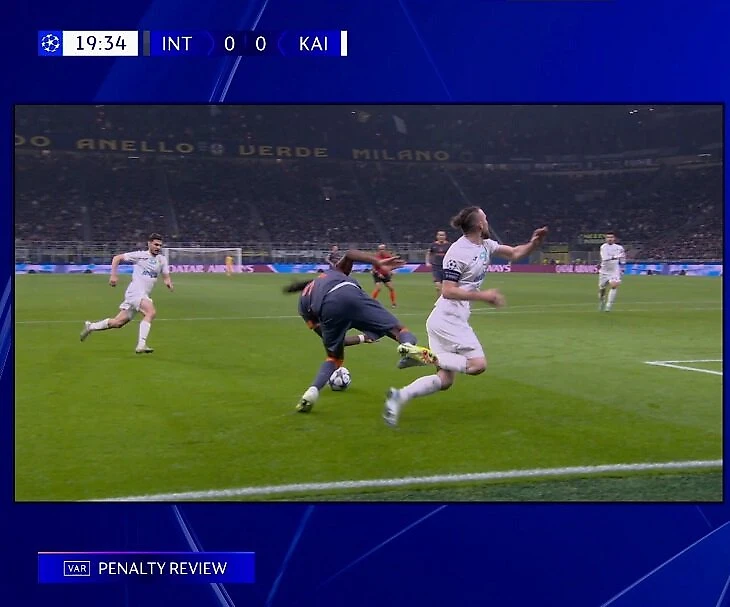 Ход матча читался: «Интер» давил, «Кайрат» отбивался. На 19-й минуте миланцы получили шанс на пенальти. Янн Биссек упал в штрафной казахстанцев при попытке обыграть защитника Офри Арада. Главный судья Луиш Годинью сначала указал на точку, но после просмотра ВАР отменил решение: фола не было.