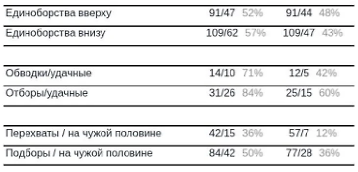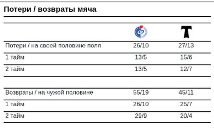 Кстати, о том, что «Торпедо» долго вкатывается в игру, говорит и такой показатель, как потери мяча на своей половине поля. Обратите внимание на цифры выше. Там мы видим, что потерь на своей половине поля у «Торпедо» в первом тайме было больше, нежели во втором. У «Факела» данный показатель в обоих таймах одинаковый. Это говорит о том, что команда действовала сбалансированно, не проседала в физике во втором тайме, что ранее наблюдалось при Шалимове. Даже более того, «Факел» во втором тайме стал больше наседать на «Торпедо». Об этом говорит большее количество возвратов на чужой половине поля во втором тайме. Здесь сказалось не только удаление у «Торпедо», но еще и грамотное тактическое перестроение от Василенко в связи с этим.