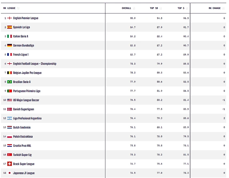 Рейтинги клубов надоели не только любителям футбола, но и тем, кто их делает. Поэтому Opta сделала рейтинг лиг.