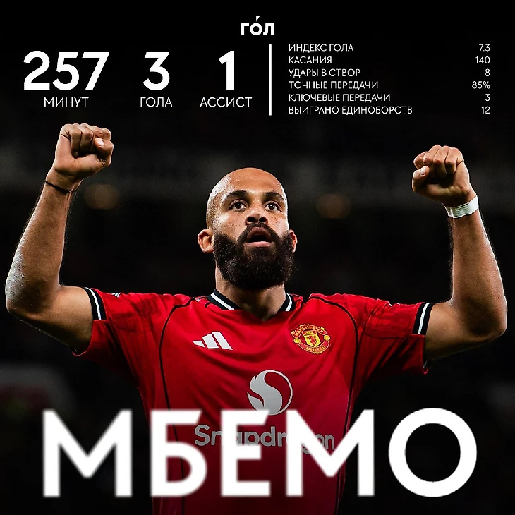 Мбемо присоединился к короткому списку недавних победителей из «МЮ»: Бруну Фернандеш (март 2025-го), Расмус Хейлунд (февраль 2024-го) и Харри Магуайр (ноябрь 2023-го).