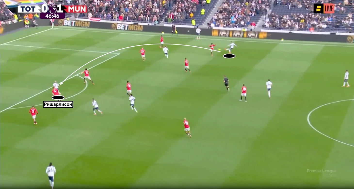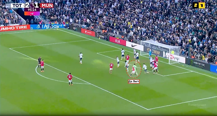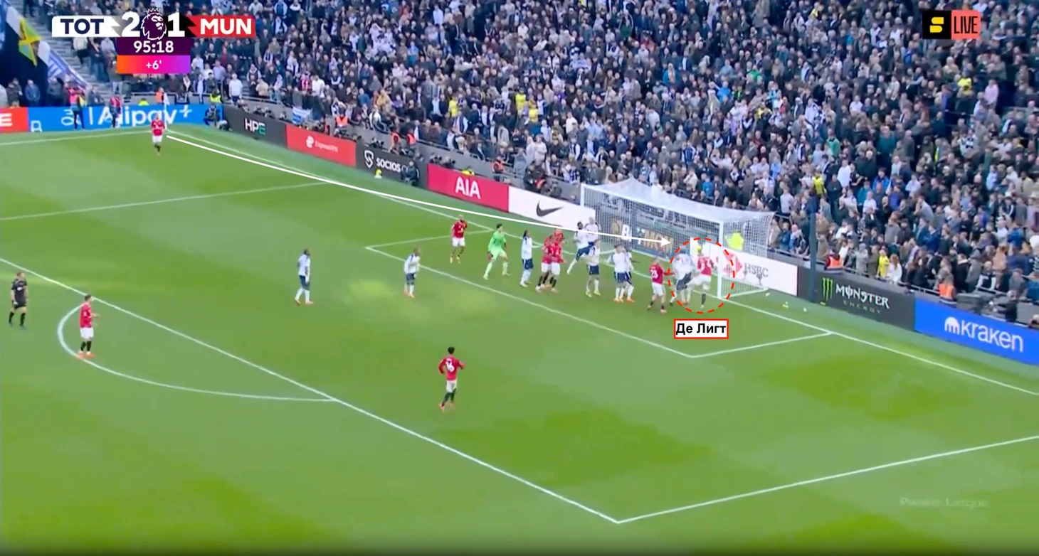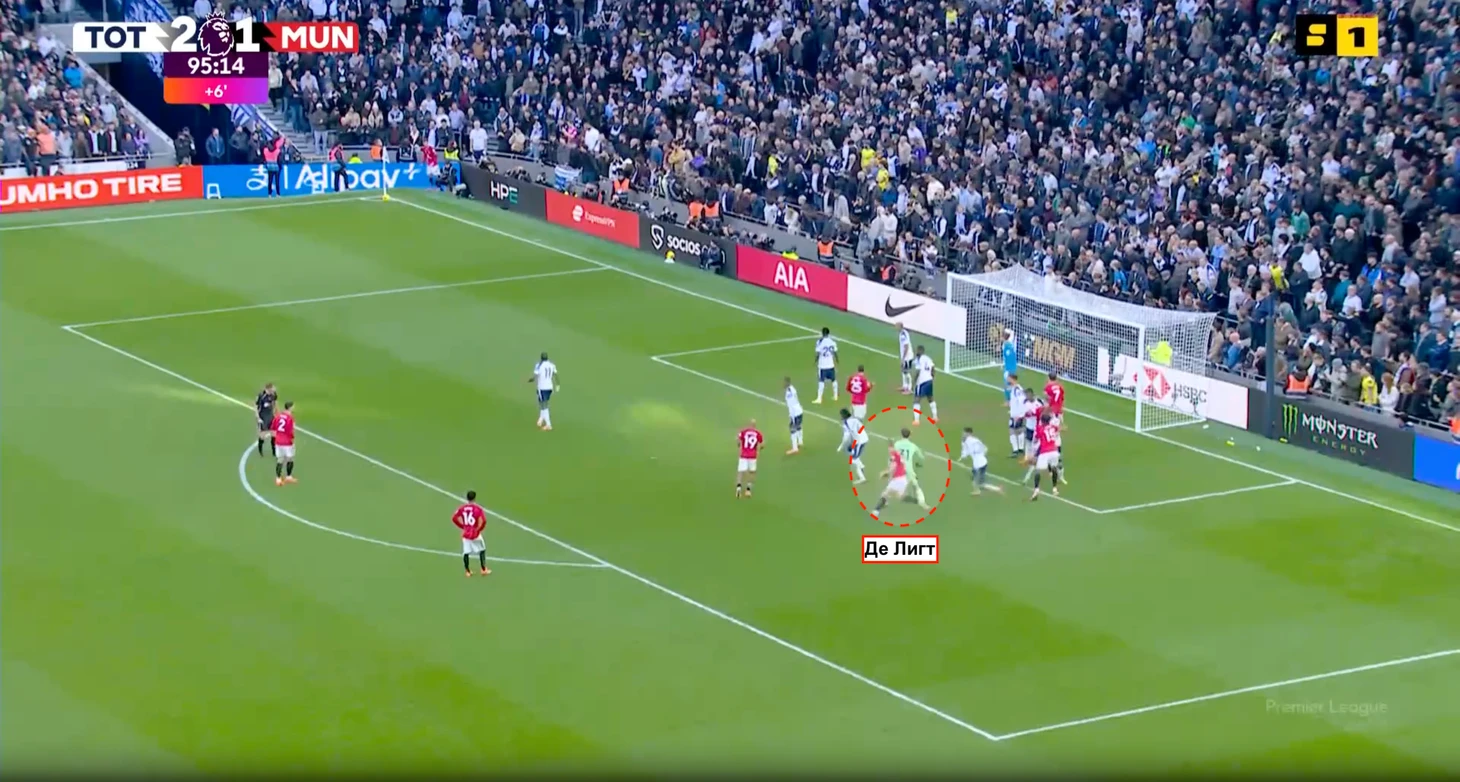 Голевому угловому «Тоттенхэма» предшествовала очередная передача с фланга в центр на Ришарлисона. Бразилец не смог встретиться с мячом, Де Лигт заблокировал прострел, но «шпоры» получили возможность разыграть угловой.