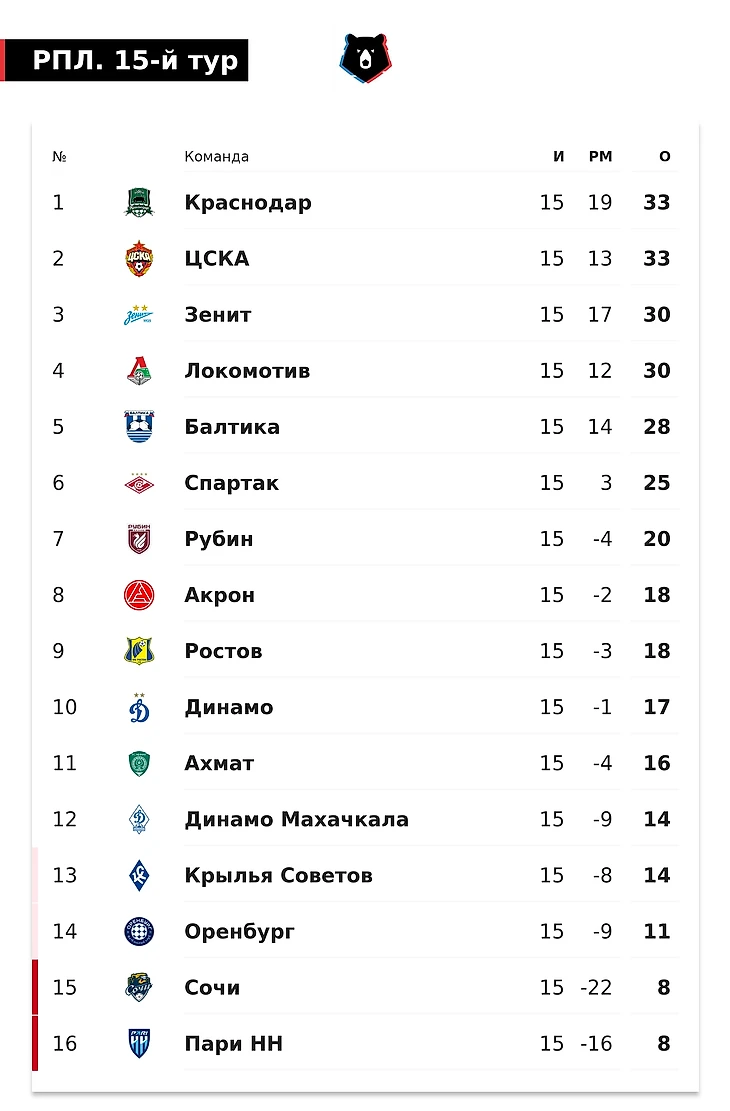 Первый круг Мир РПЛ – все. Закончился 15-й тур, с такой таблицей уходим на международную паузу.