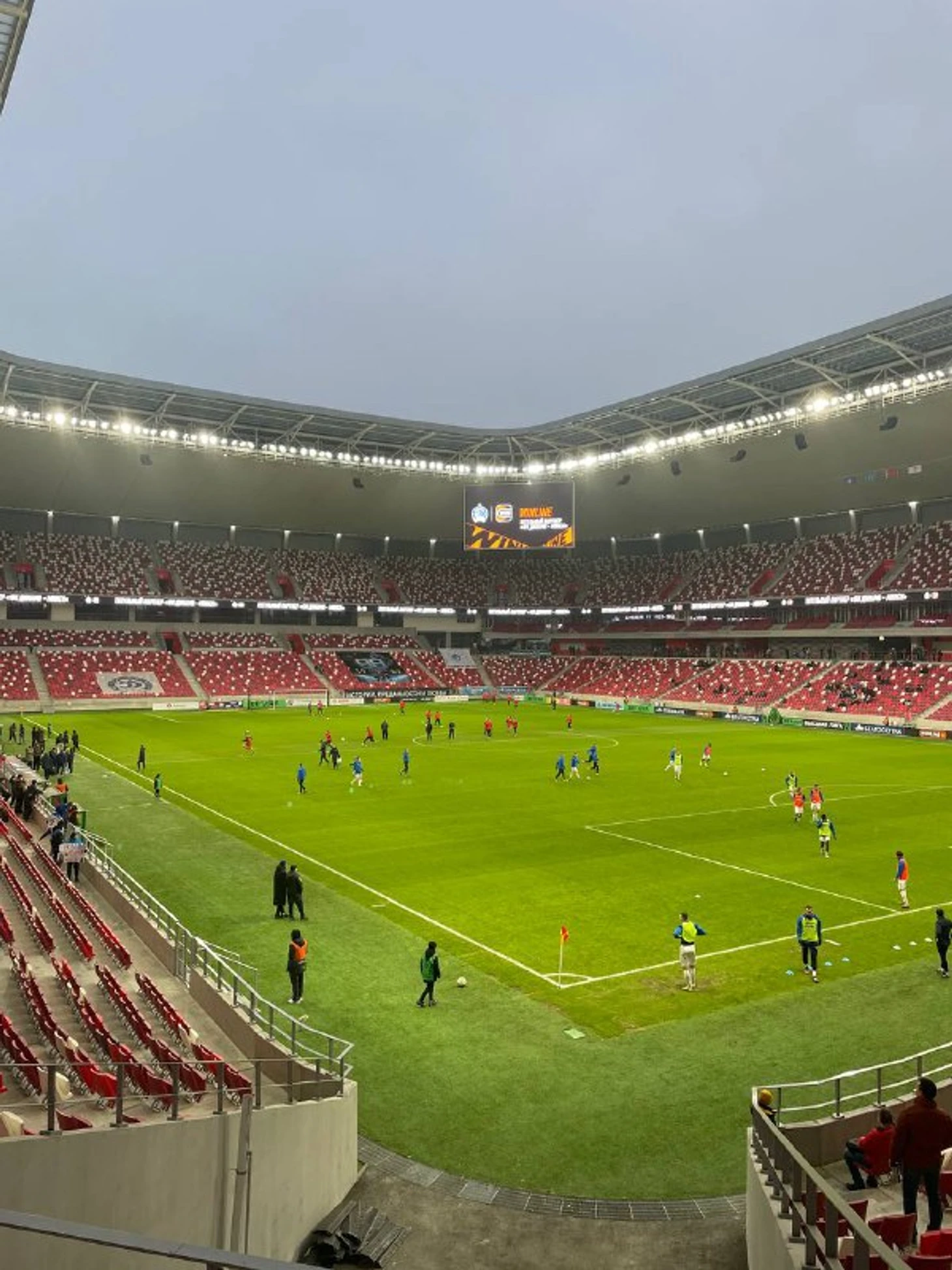 Поднялись наверх, сделали пару фотографий, зашли в фаншоп. Кстати, выбор хороший. Значки, шарфы, программки, форма вполне себе симпатичная за 103 рубля местных денег (в Российских рублях это ~2500). Купили себе чаю с хот догом и присели за столик. Футболисты выходят на поле, звучит гимн страны, солдаты срочники с радостными глазами поют его и видно, что кайфуют от нахождения на стадионе. Мы же прошлись вдоль трибуны, заценили два, если так можно назвать, фанатских сектора. Все мы прекрасно знаем, что фанаты не ходят здесь. Дальше, да простят меня отцы граундхоппинга, но мы посмотрели примерно 10 минут матча и отправились к основной цели нашей поездки.