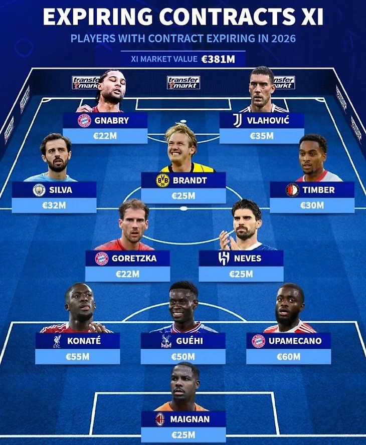 Transfermarkt собрал в одну сборную одиннадцать самых дорогих игроков, чьи контракты с нынешними клубами истекут летом 2026-го. Получилась команда уровня Лиги чемпионов.