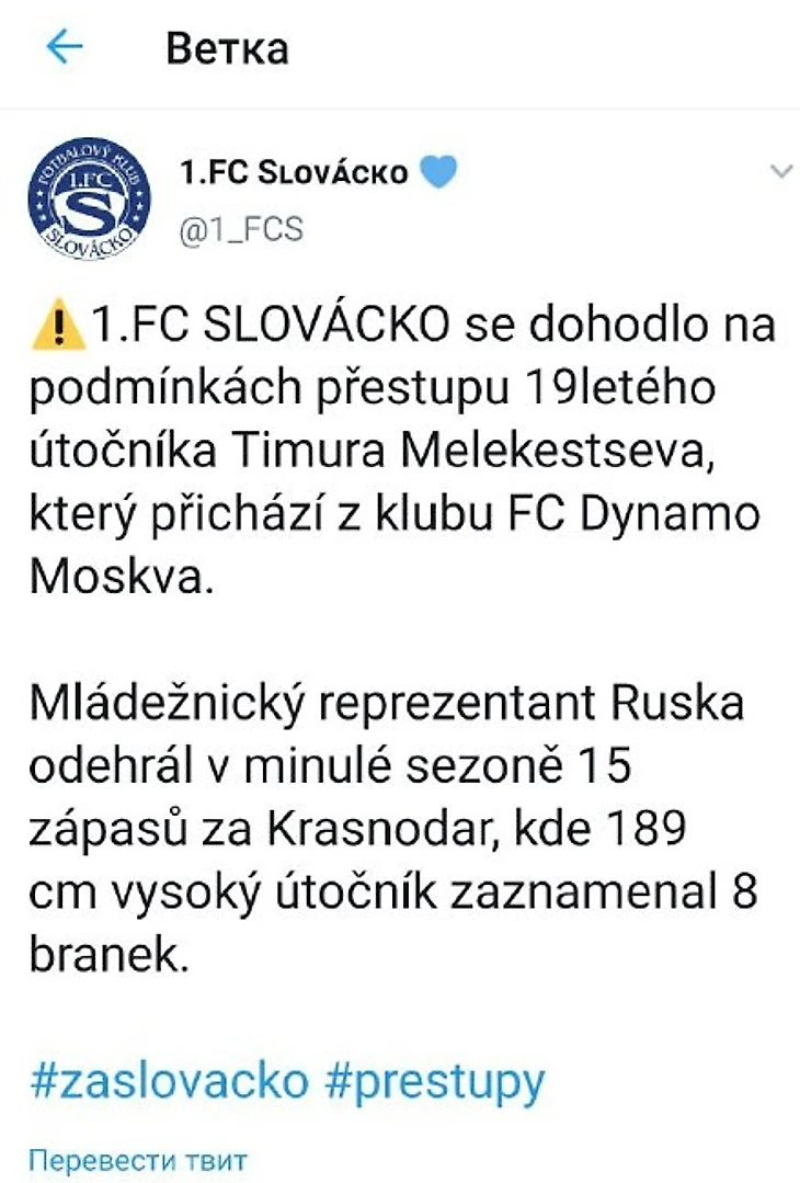 (Перевод) «Чешский клуб высшего дивизиона ФК «Словацко» забирает 19-летнего нападающего московского «Динамо» Тимура Мелекесцева. 15 матчей и 8 мячей за «маленький» «Краснодар»
