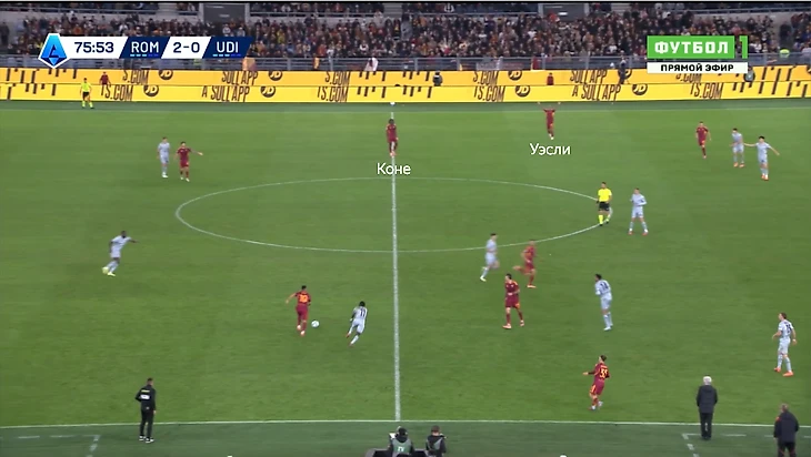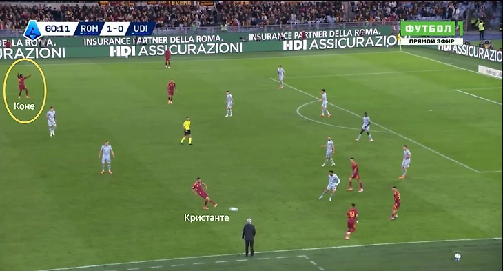 Второй гол «Ромы» в игре с «Удинезе» спешит опровергнуть мою теорию. Гол получился - ВАУ, а в атаку вместились перевод на другой фланг и даже комбинация через центр. Но обратите внимание, как недоволен Коне за несколько секунд до гола когда его, открытого слева, игнорирует Кристанте.