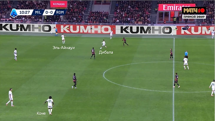 В этом эпизоде за линией мяча находятся сразу два опорных полузащитника «Ромы»: Коне и Эль-Айнауи. Дополнительно на свою половину опустился Дибала. В итоге получилась ситуация 6 на 3 - безопасный сценарий для и без того пассивного в прессинге «Милана».