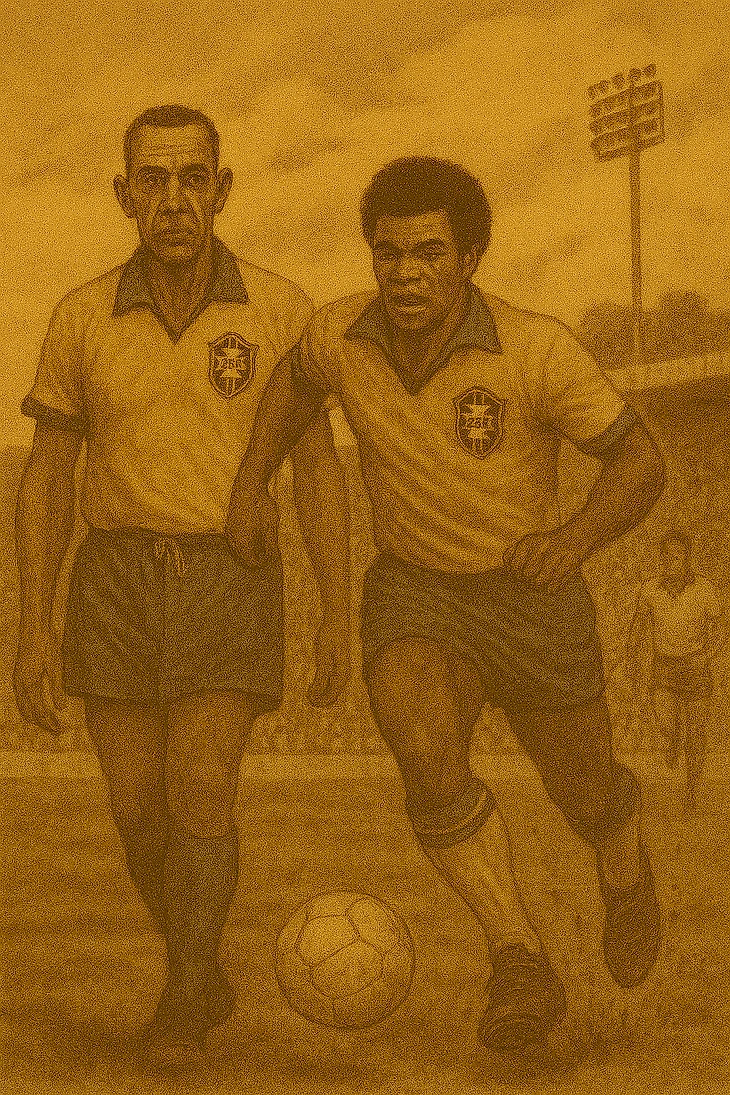 В этой драматической эпохе, словно в кинематографическом повествовании, появляются герои, чьи судьбы становятся символами целого поколения. Их имена — Пеле, Гарринча, Диди, Вава, Жаирзиньо — вписаны золотыми буквами в историю футбола и культуры Бразилии. Их личные истории, взлеты и падения, моменты триумфа и трагедии, сливаются с историей страны, создавая уникальный сплав искусства, спорта и человеческой драмы.