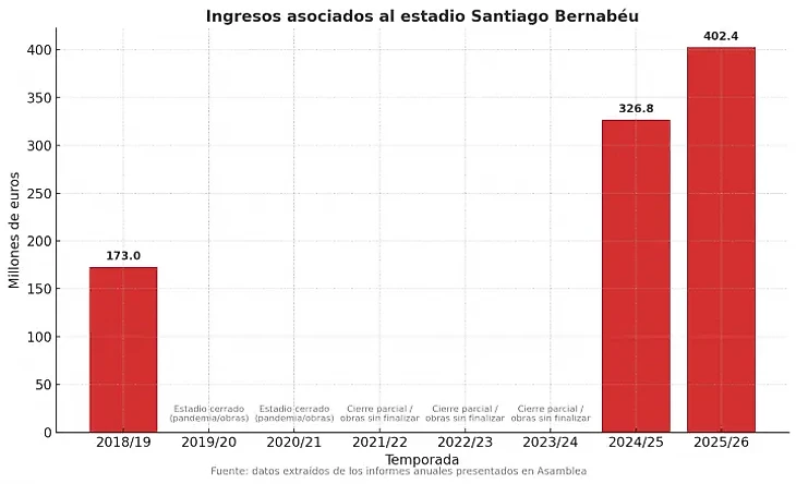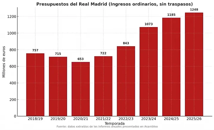 Бюджет на 2025/26 показывает направление: 1.248 миллионов евро доходов, почти на 500 миллионов больше, чем в последнем полном сезоне до начала реконструкции (2018/19). Доходы от стадиона увеличились на 130%, превратив Бернабеу в золотую жилу для клуба.