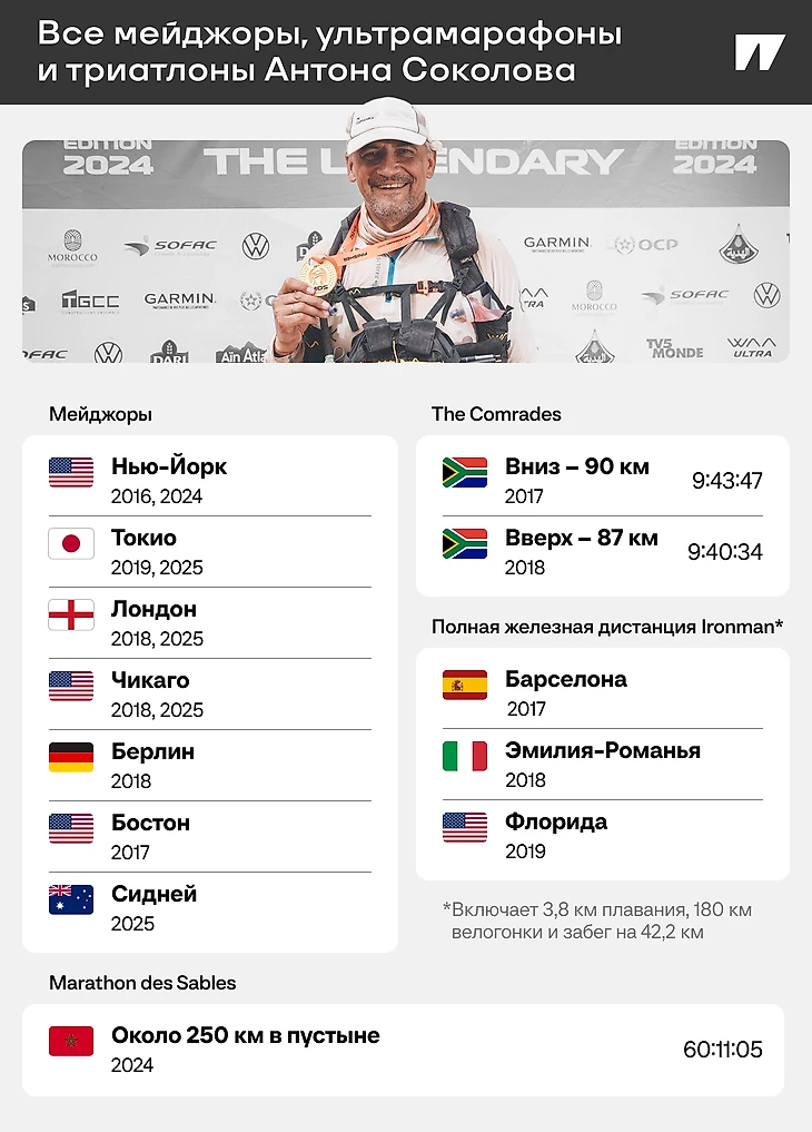 Соколов пробежал все мейджоры, трижды делал полную железную дистанцию Ironman и дважды преодолел главный ультрамарафон мира