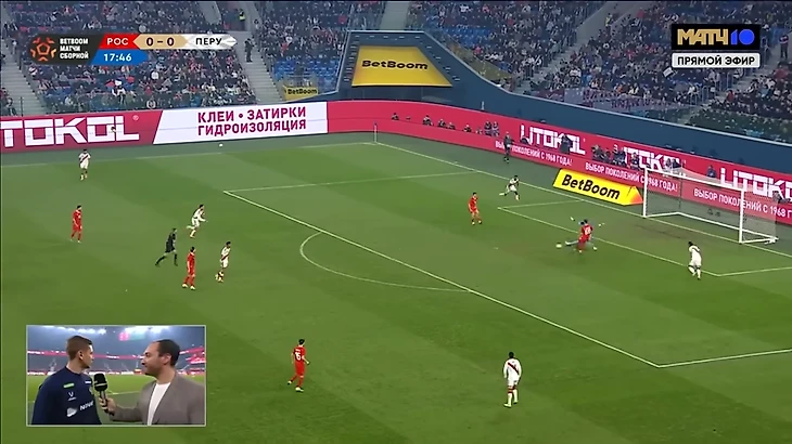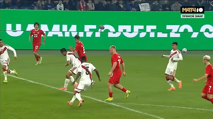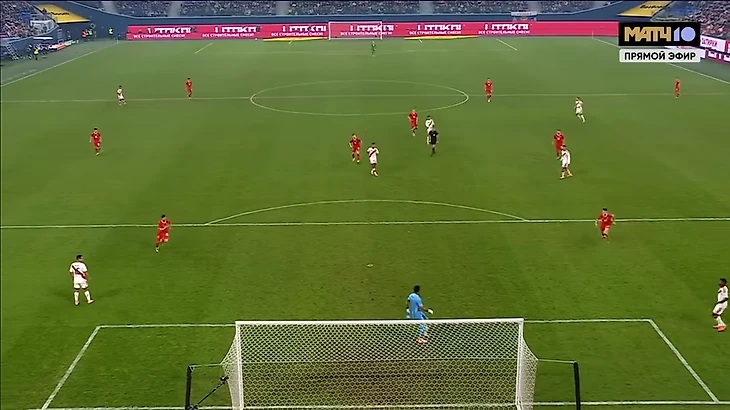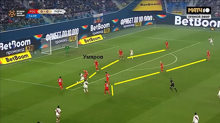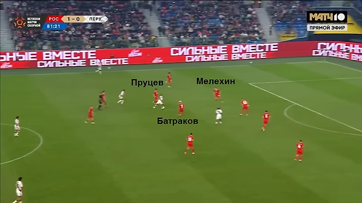 Вчера в этой роли был Умяров - и надо отметить сыграл надежно. Интересно, что соперник против 9 обороняющихся атаковал только 5 футболистами, поэтому на скрине мы и видим, что Головин и Батраков просто «смотрят футбол» - роли в защите для них нет. Хотя и Пруцев с Миранчуком не сильно в игру вовлечены. Но это ладно, непонятно почему Мелехин просто плассируется под атакующего, не вступая с ним в борьбу за мяч. Это приводит к удару в створ ворот - единственному в 1 тайме от перуанцев.И это - еще одна черта этого состава сборной - центральные защитники в ней (Мелехин и Осипенко) отобрать мяч без нарушения правил видимо не могут, поэтому просто сопровождают соперника, пытаясь только блокировать удары. А Вахания в роли латераля при 2 форвардах у соперника, совсем потерялся, недаром был быстро заменен на Бевеева (правда Мингиян - левый латераль, а не правый, каким стал здесь).
