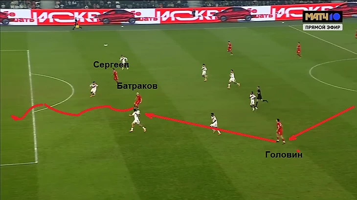 Головин получил мяч из глубины на фланг и вывел Батракова в полуфланг, который на дриблинге прорвался в штрафную и покатил мяч под удар Сергееву