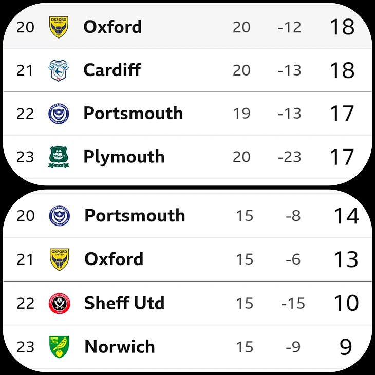 После 15 туров с Гари Роуэттом «Оксфорд» набрал 13 очков. В прошлом году Дез Бакингем был уволен после 20-го тура, когда у команды было 18 баллов. После выхода с паузы на матчи сборных у «Оксфорда» ультракороткая неделя с расписанием «Мидлсбро» - «Норвич» - «Ипсвич» до конца осени. Если это 0 очков из 9, то Роуэтту вряд ли выжить на своем месте. Есть кстати некоторая интрига в том, что «Мидлсбро» и «Норвич» сейчас остались без менеджеров. У первых «Вулверхэмптон» увел Роба Эдвардса, а вторые уволили Лайама Мэннинга после линейки результатов 0W-0D-7L в домашних играх (у «канареек» и в 8 последних турах набрано лишь одно очко).