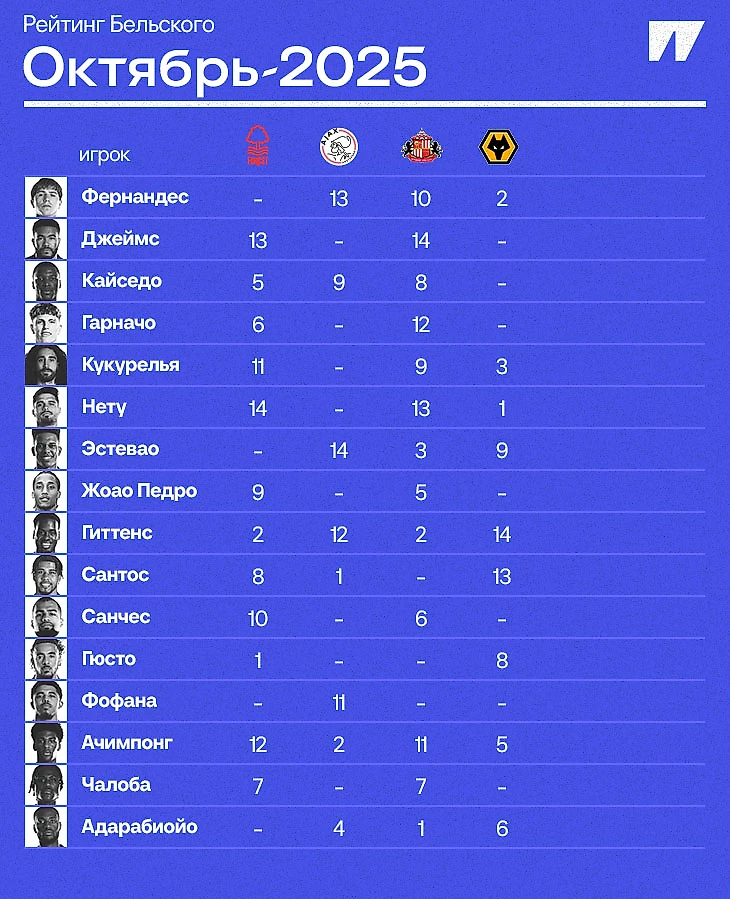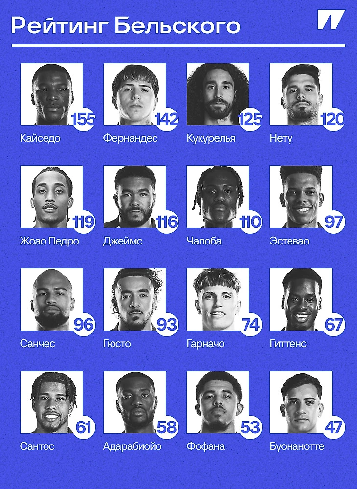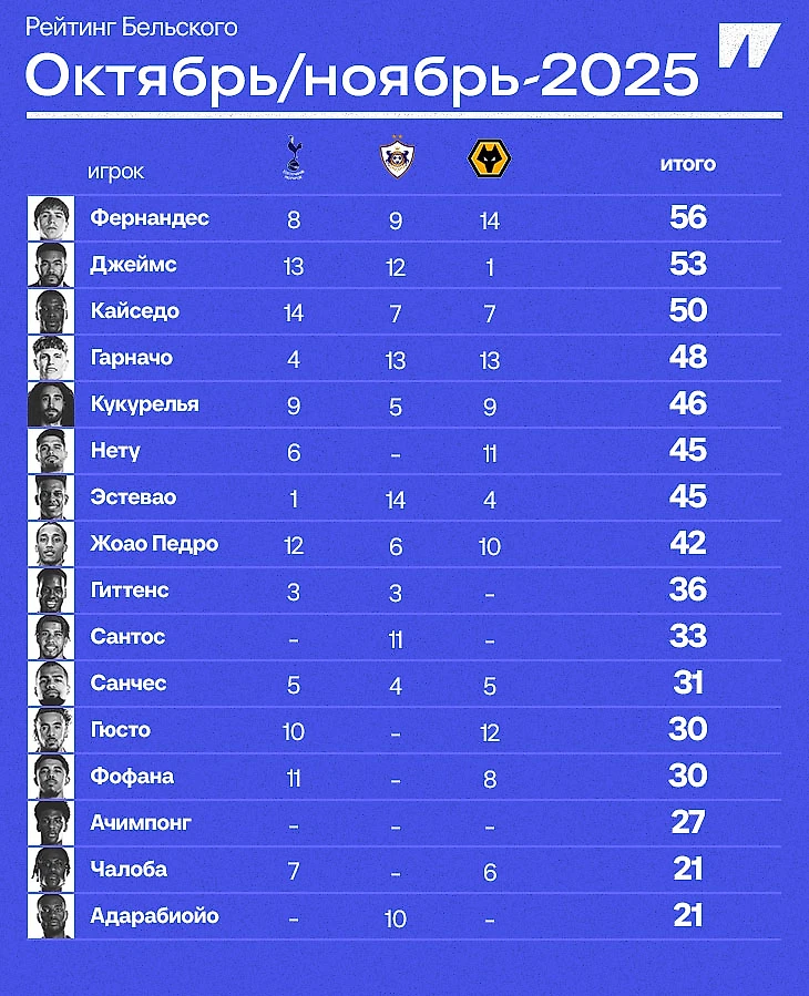 Плотность таблицы подросла: к Кайседо приблизился Фернандес, не так далеко и Кукурелья с Нету. Педру вообще впервые ворвался в топ-4 в общем зачете, оставив позади Жоао Педро. Радует и Джеймс в топ-6, и Эстевао, забравшийся уже в топ-8. В начале октября Гарначо замыкал топ-16, а теперь ворвался по полной. Тут выскочил и Фофана: радостно, что он и Джеймс, которые в прошлом сезоне не попадали на эту картинку во многом из-за травм, наконец стали мелькать чаще.