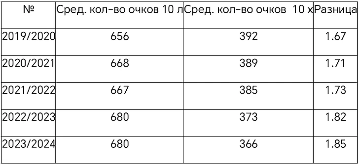 Мы можем наблюдать что разница в очках между первым и последним местом не влияет на улучшение или ухудшение средней разницы очков в среднем. Так как самая большая разница составляет 78 очков в сезоне 2019/2020, средняя разница очков между первыми десятью клубами и вторыми составляет 1.67. Самая маленькая разница составляет 63 очка в сезоне 2020/2021, средняя разница очков между первыми десятью клубами и вторыми составляет 1.71. А в сезоне 2023/2024 разница составляет 75 очков, средняя разница очков между первыми десятью и вторыми составляет 1.85.