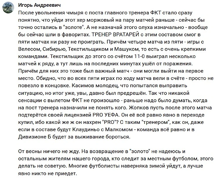 Иваново же напротив радуется великолепному отрезку своей команды, которая смогла справиться с тяжелым периодом и показала отличные результаты под конец. Да, обидные ничьи и поражения также сказались на итоговом месте, но всё же «жаркие деньки» начнутся во второй части сезона, уже весной. Поэтому сейчас важно хорошо отдохнуть, собраться с мыслями и вновь окунуться в борьбу за выход в ФНЛ — ой, извините, Лучшую Лигу Мира.😁😎