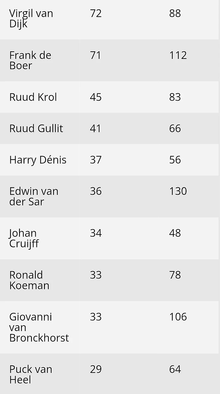 Ван Дайк был капитаном сборной Нидерландов в 72-й раз в матче против Литвы. За свою выдающуюся карьеру Де Бур носил капитанскую повязку в 71 международном матче. Последний из которых состоялся 26 июня 2004 года на Чемпионате Европы в Португалии в матче против Швеции. Теперь, спустя более 21 год, он уступил первое место Ван Дайку. И, очень надеюсь, что впереди у «четвёрки» ещё очень много поединков за сборную. А значит, цифра сыгранных им капитанских матчей может стать недосягаемой для ближайших поколений.