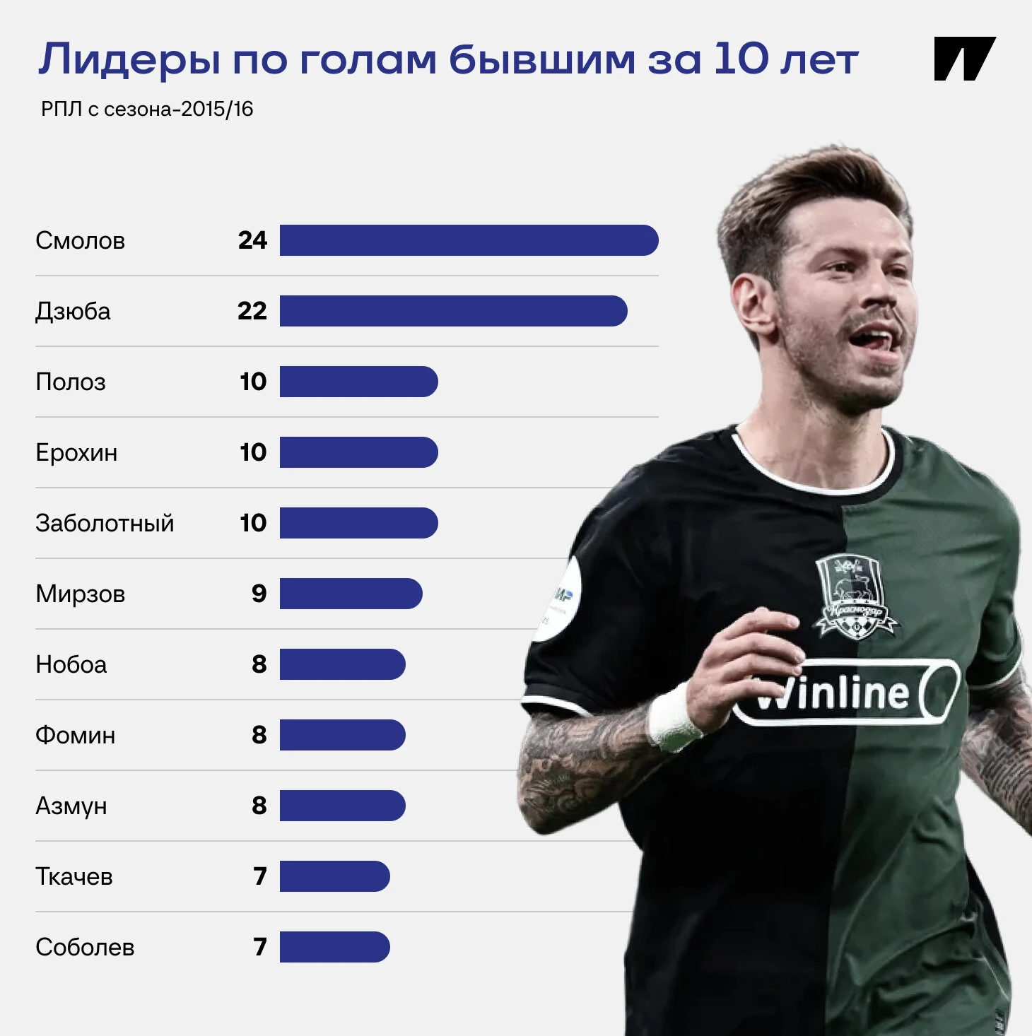 И с Семаком, и с Веретенниковым сложно спорить. Ведь теорию доказывали многие большие российские игроки. Лидер по голам бывшим за 10 лет (с сезона-2015/16) – Федор Смолов (24 мяча). Как-то в футболке «Урала» он забил «Динамо» ударом через себя – празднуя гол, приложил руку к уху, перепрыгнул рекламный щит и побежал к трибуне.