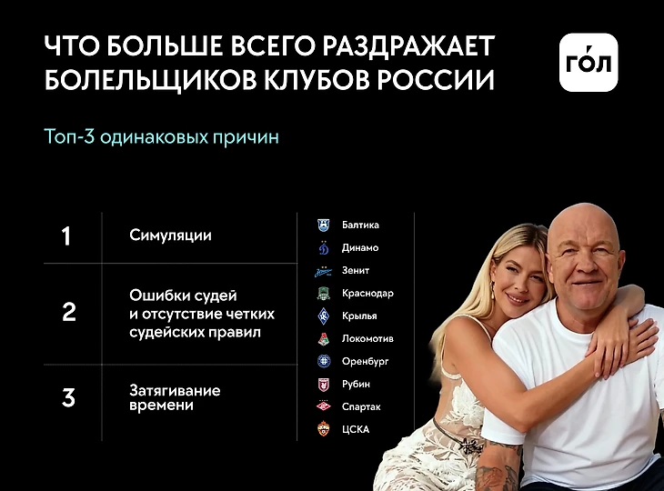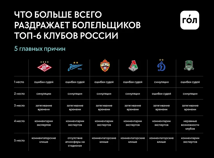 Теперь можем определить, есть ли особенные критерии у болельщиков отдельных команд. У фанатов большинства клубов (десяти в РПЛ) – три главные причины для раздражения. И они повторяются: симуляции, ошибки судей и затягивание времени.