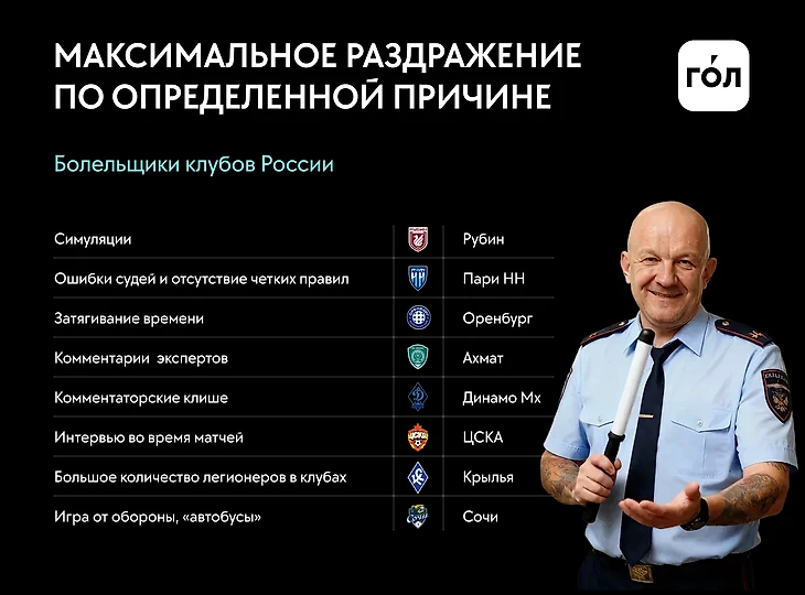 Фанатов 11 команд пункт с ошибками судей раздражает больше остальных, еще у двух – делит первое место. «Людей всегда бесит работа судей, – комментирует исследование ГОЛа бывший арбитр и эксперт Сергей Лапочкин. – Никто не хочет признавать своих ошибок – проще переложить на другого. Никто не говорит, что тренер плохо отработал, а футболист – не забил с метра.
