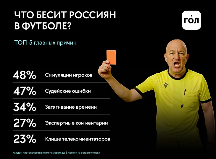 Изначально более 550 человек ответили, что их раздражает в современном футболе и вокруг него. Далее по этим критериям проголосовали более 1550 респондентов, которые увлекаются футболом. Так была сформирована общая статистика.