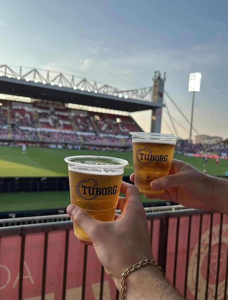 С атмосферой на стадионе тоже полный порядок: пивко в толстенных стеклянных кружках и шашлычок с соленым огурчиком.