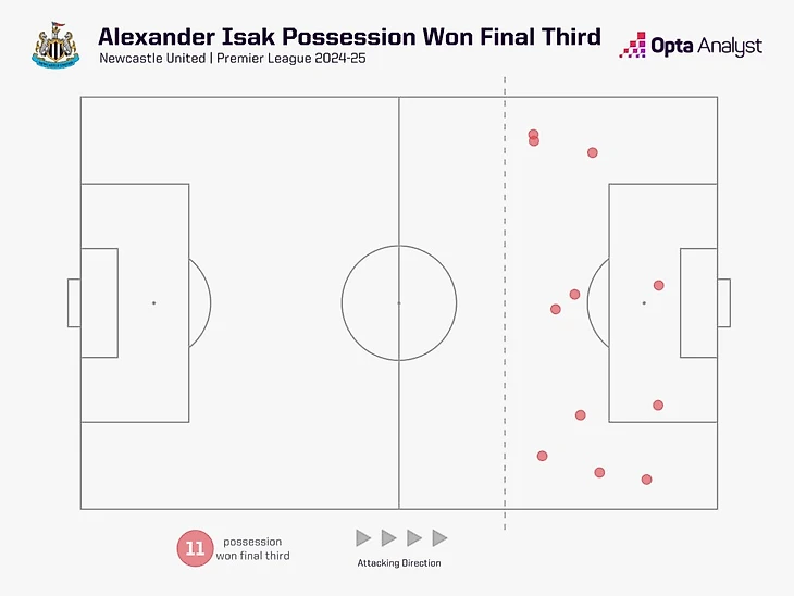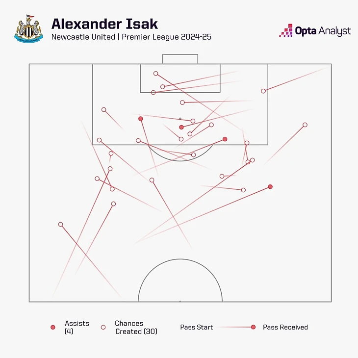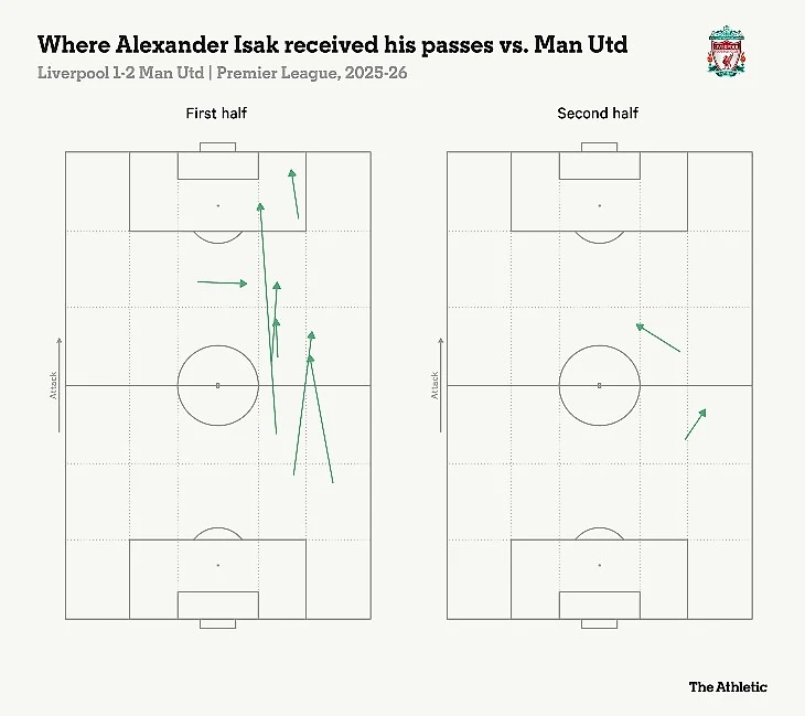 Еще одна показательная ситуация — матч, который не хочется вспоминать. Речь о поражении на домашней арене главному историческому сопернику — «Манчестер Юнайтед». Алекс вышел в стартовом составе, но «красные» смотрелись настолько блекло, что до Исака мяч практически не доходил. Из-за этого ему приходилось искать возможности самому, что отражает еще одна графика The Athletic.