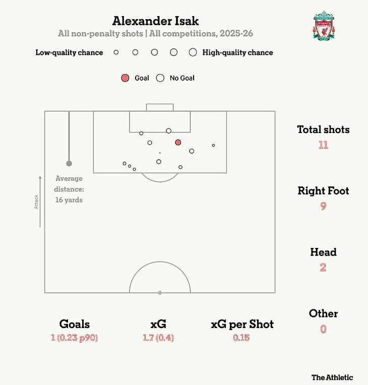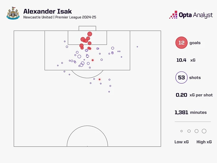 Карта ударов форварда, согласно данным аналитиков, подсвечивает две главные проблемы: общее количество моментов Исака слишком мало, а качество имеющихся — низкое.
